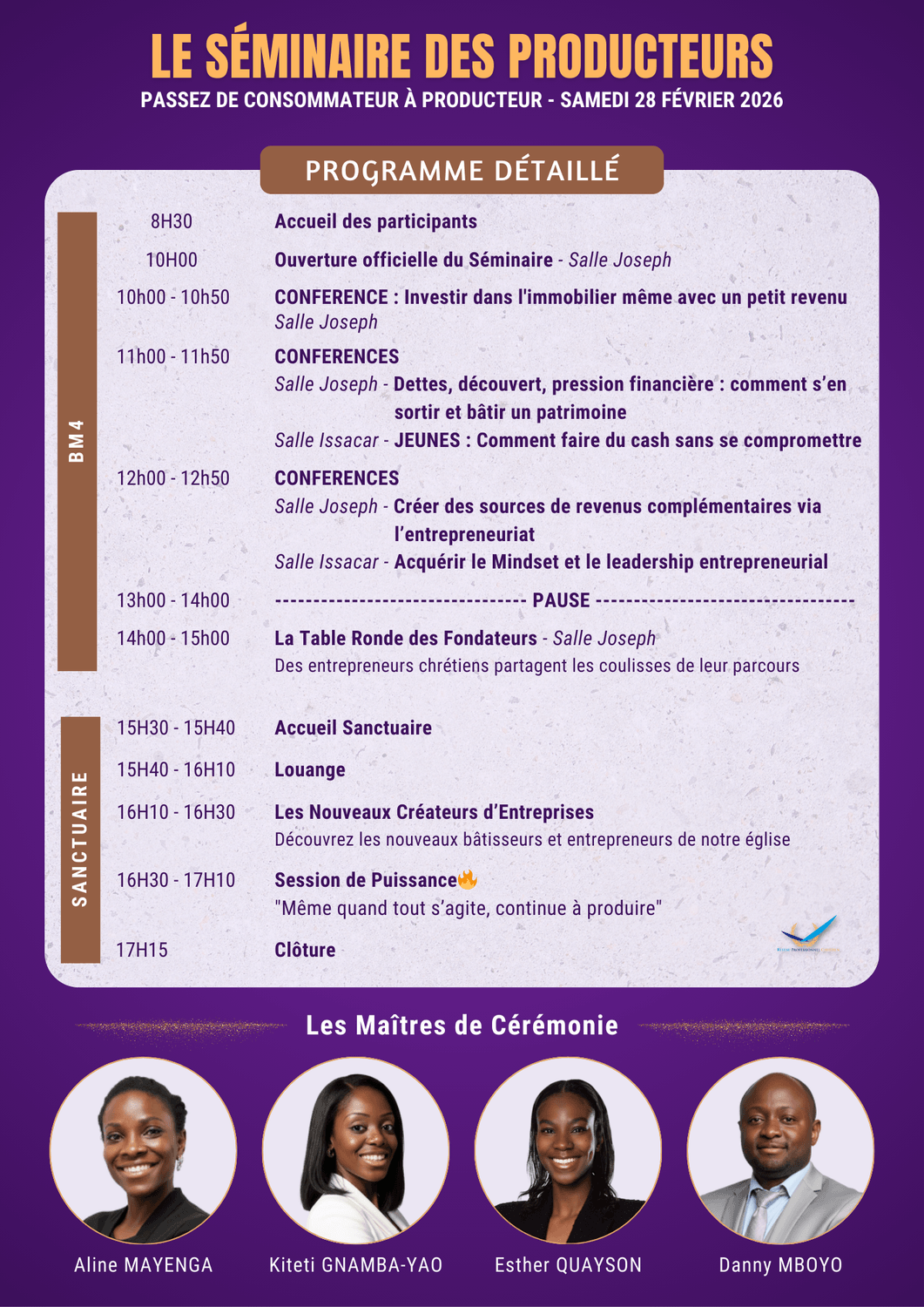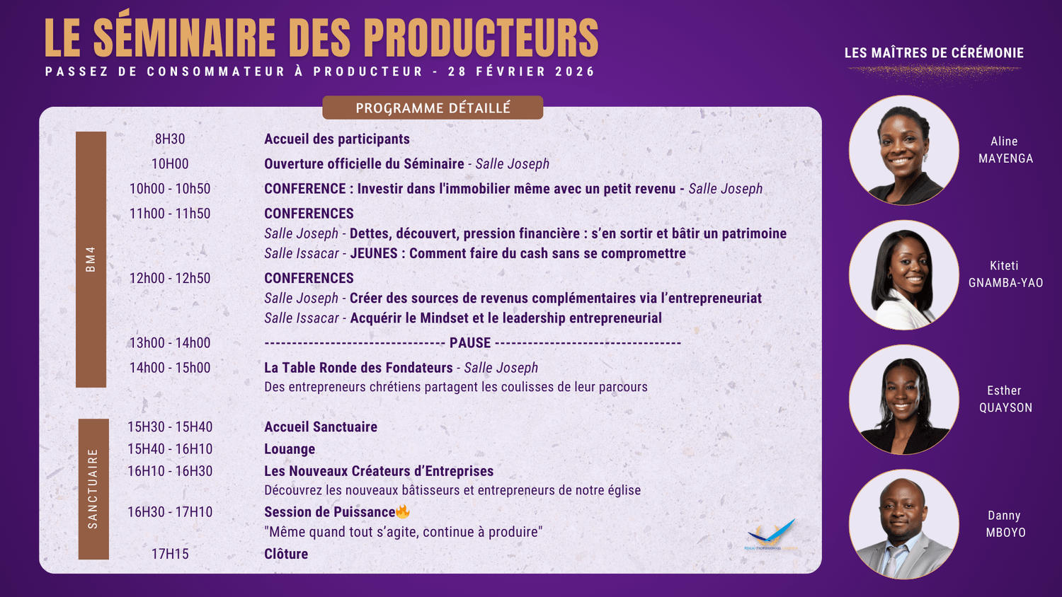 Tout au long de la journée, nos intervenants partageront leur expertise, leurs expériences et les enseignements tirés de leur parcours professionnel, entrepreneurial et spirituel.